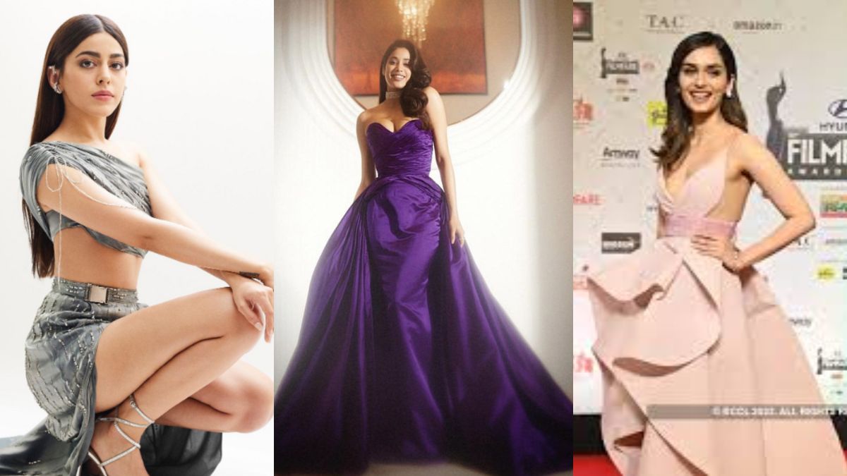 Jhanvi Kapoor was seen wearing a purple off shoulder gown from Guri and Nainika. Her vintage hairstyle with long side parted curls and nude makeup made her look ravishing.