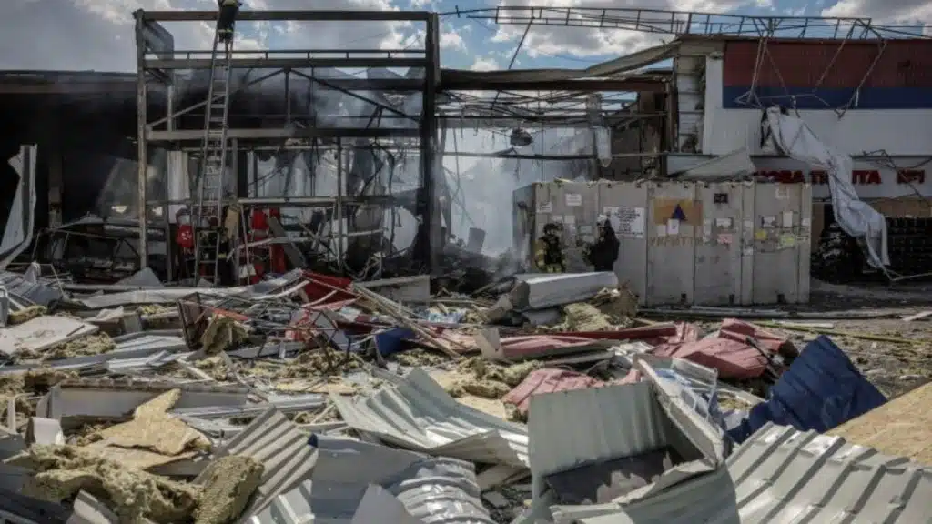 The missile hit during peak hours, targeting both the supermarket and a nearby post office, Ukrainian authorities reported. The blast caused expansive damage, reducing the supermarket to a mound of smoldering debris, trapping several people underneath. Rescue operations are ongoing, with emergency services working frantically to find survivors amidst the debris.