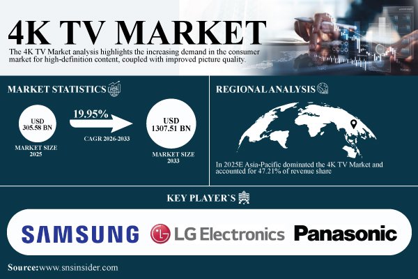 According to the SNS Insider,“The global 4K TV Market size was valued at USD 305.58 Billion in 2025E and is projected to reach USD 1307.51 Billion by 2033, growing at a CAGR of 19.95% during 2026-2033.”