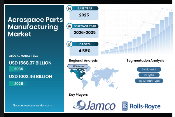 Austin, Texas, Feb. 02, 2026 (GLOBE NEWSWIRE) — According to SNS Insider, the Aerospace Parts Manufacturing Market size was estimated to be worth USD 1,002.46 billion in 2025 and is projected to reach USD 1,568.37 billion by 2035, registering a CAGR of 4.58% from 2026 to 2035. The industry remains on an upward trajectory as companies increasingly focus on precision parts, automation, and the use of advanced materials to meet the tough requirements of performance and safety in the commercial, defense, and space industries.