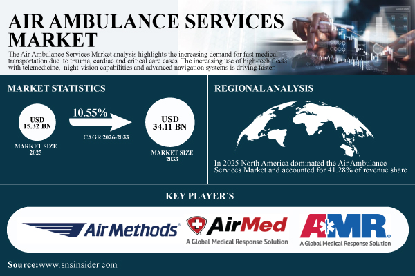 According to SNS Insider, the Air Ambulance Services Market size is valued at USD 15.32 billion in 2025E and is projected to reach USD 34.11 billion by 2033, expanding at a CAGR of 10.55% during the forecast period of 2026–2033.