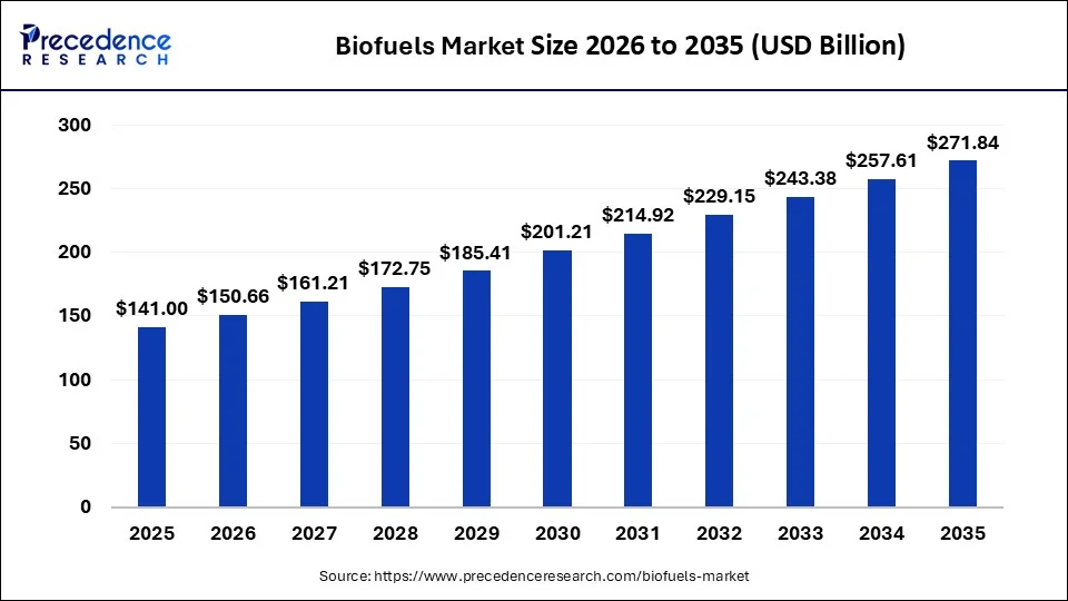Ottawa, April 27, 2026 (GLOBE NEWSWIRE) — According to Precedence Research, the global biofuels market size will grow from USD 150.66 billion in 2026 to nearly USD 271.84 billion by 2035, accelerating with a solid CAGR of 6.78% from 2026 to 2035. The market is expanding steadily due to government blending mandates, rising fossil fuel concerns, & raised investments in sustainable aviation fuel & advanced bioenergy technologies.