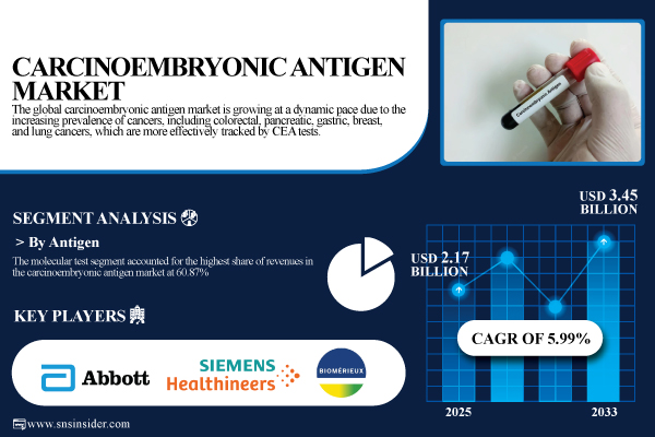 According to S&S Insider Research, the Carcinoembryonic Antigen Market was valued at USD 2.17 billion in 2025E and is projected to reach USD 3.45 billion by 2033, growing at a CAGR of 5.99% during 2026–2033.