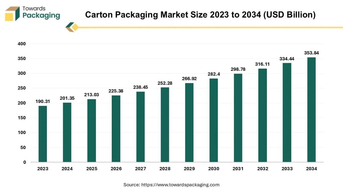 As per market analysts at Towards Packaging, the global carton packaging market is expected to grow from USD 225.38 billion in 2026 to nearly USD 353.84 billion by 2034, registering a CAGR of 5.8% between 2025 and 2034.
