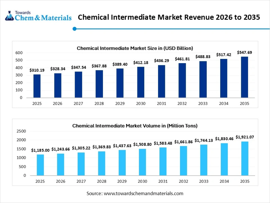 According to Towards Chemicals and Materials Analytics and Consulting, the global chemical intermediate market size reached USD 310.19 billion in 2025 and is expected to be worth around USD 547.69 billion by 2035, exhibiting a compound annual growth rate (CAGR) of 5.85% over the forecast period from 2026 to 2035.