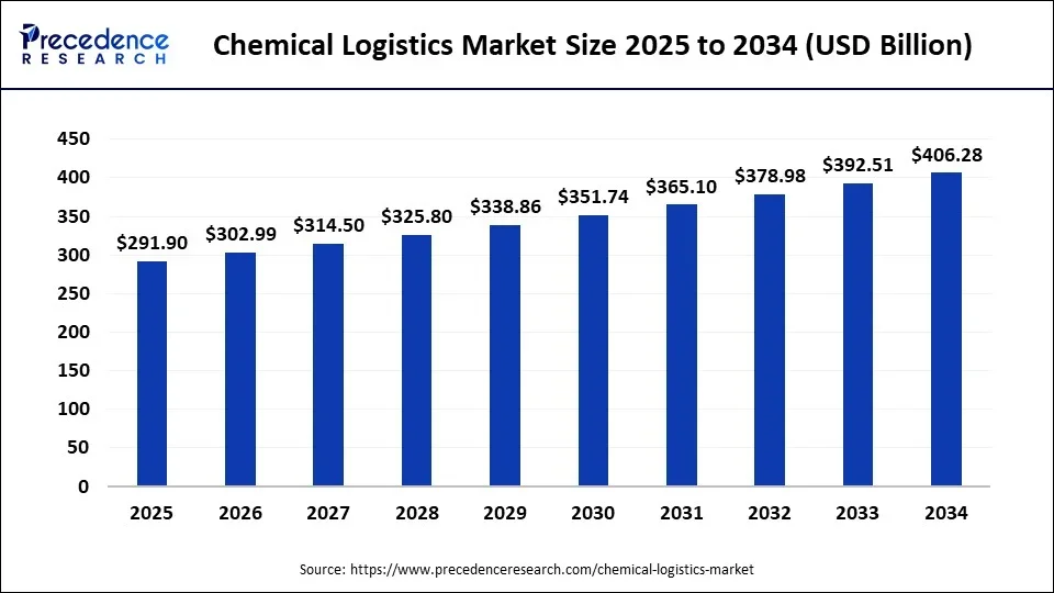 Ottawa, Oct. 14, 2025 (GLOBE NEWSWIRE) — The global chemical logistics market size accounted for USD 291.90 billion in 2025 and is expected to grow from USD 302.99 billion in 2026 to approximately USD 406.28 billion by 2034, growing at a CAGR of 3.75% from 2025 to 2034. The growing expansion of the chemical manufacturing landscape and increasing demand for chemicals drive the market growth.