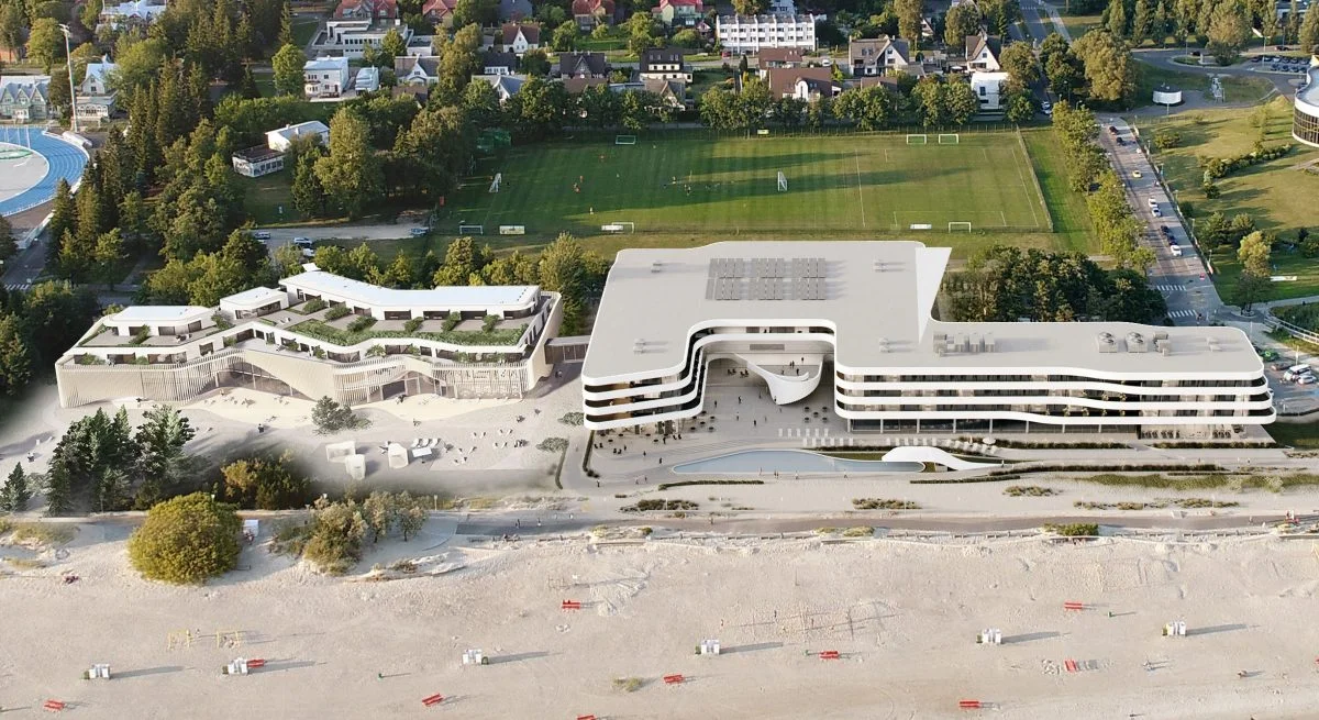 The contract covers the construction of two new seafront buildings complex, consisting of two buildings and a beach club area, on the Pärnu waterfront – a spa hotel with a gross area of 23,000 square meters and 210 rooms, alongside a 7,000‑square‑meter conference centre featuring 16 guest apartments in addition to event spaces. The four-story buildings are interconnected by a gallery on the second floor, as well as connected underground parking floors with a total of over 160 parking spaces. The complex will seek LEED Platinum certification for energy efficiency.