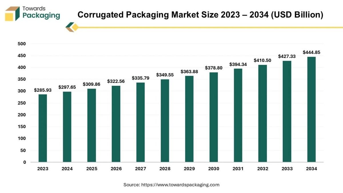 As reported by Towards Packaging experts, the global corrugated packaging market is anticipated to rise from USD 322.56 billion in 2026 to approximately USD 444.85 billion by 2034, with a CAGR of 4.10% from 2025 to 2034.