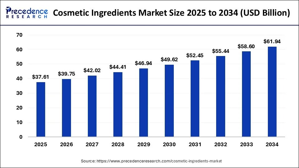 According to Precedence Research, the global cosmetic ingredients market size is expected to be worth USD 61.94 billion by 2034, growing from USD 35.58 billion in 2025 with a solid CAGR of 5.70% from 2025 to 2034. Growth is fueled by rising demand for natural and eco-friendly solutions, advances in biotechnology, and increasing consumer awareness of clean-label products, making sustainability and innovation central to the market’s future.