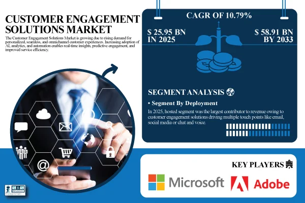 Austin, Dec. 09, 2025 (GLOBE NEWSWIRE) — The global Customer Engagement Solutions Market was valued at USD 25.95 billion in 2025E and is expected to reach USD 58.91 billion by 2033, growing at a CAGR of 10.79% from 2026-2033.