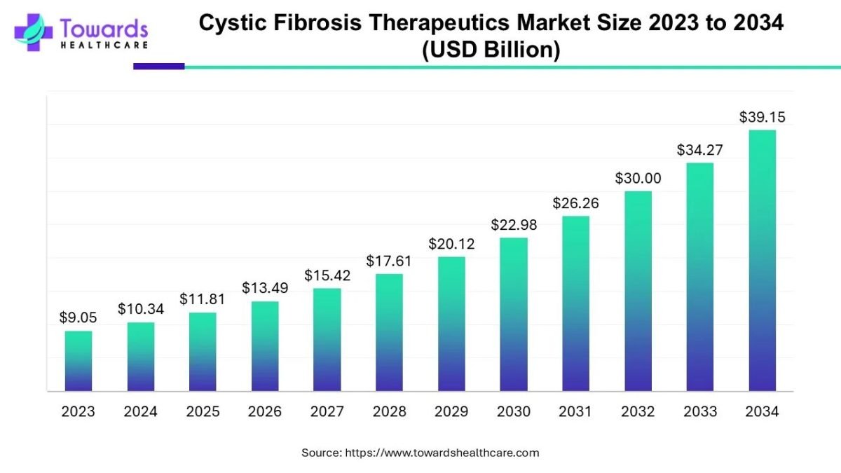 Ottawa, Sept. 26, 2025 (GLOBE NEWSWIRE) — The global cystic fibrosis therapeutics market size was valued at USD 10.34 billion in 2024 and is predicted to hit around USD 39.15 billion by 2034, rising at a 14.24% CAGR, a study published by Towards Healthcare a sister firm of Precedence Research.