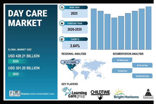 Austin, April 17, 2026 (GLOBE NEWSWIRE) — According to SNS Insider, The Day Care Market size is valued at USD 301.20 Billion in 2025 and is projected to reach USD 428.21 Billion by 2035, growing at a CAGR of 3.64% during 2026–2035.