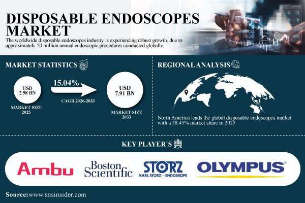 According to SNS Insider, the global Disposable Endoscopes Market was valued at USD 2.58 billion in 2025E and is projected to reach USD 7.91 billion by 2033, growing at a CAGR of 15.04% during the forecast period 2026–2033. The U.S. market, valued at USD 0.81 billion in 2025E, is expected to grow to USD 2.39 billion by 2033, supported by increasing demand for single-use medical devices, heightened infection control protocols, regulatory support, and rapid technological innovation.
