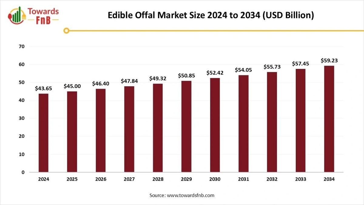 Ottawa, Nov. 06, 2025 (GLOBE NEWSWIRE) — The global edible offal market size was valued at USD 43.65 billion in 2024 and is expected to grow steadily from USD 45 billion in 2025 to reach nearly USD 59.23 billion by 2034, according to a report published by Towards FnB, a sister firm of Precedence Research.