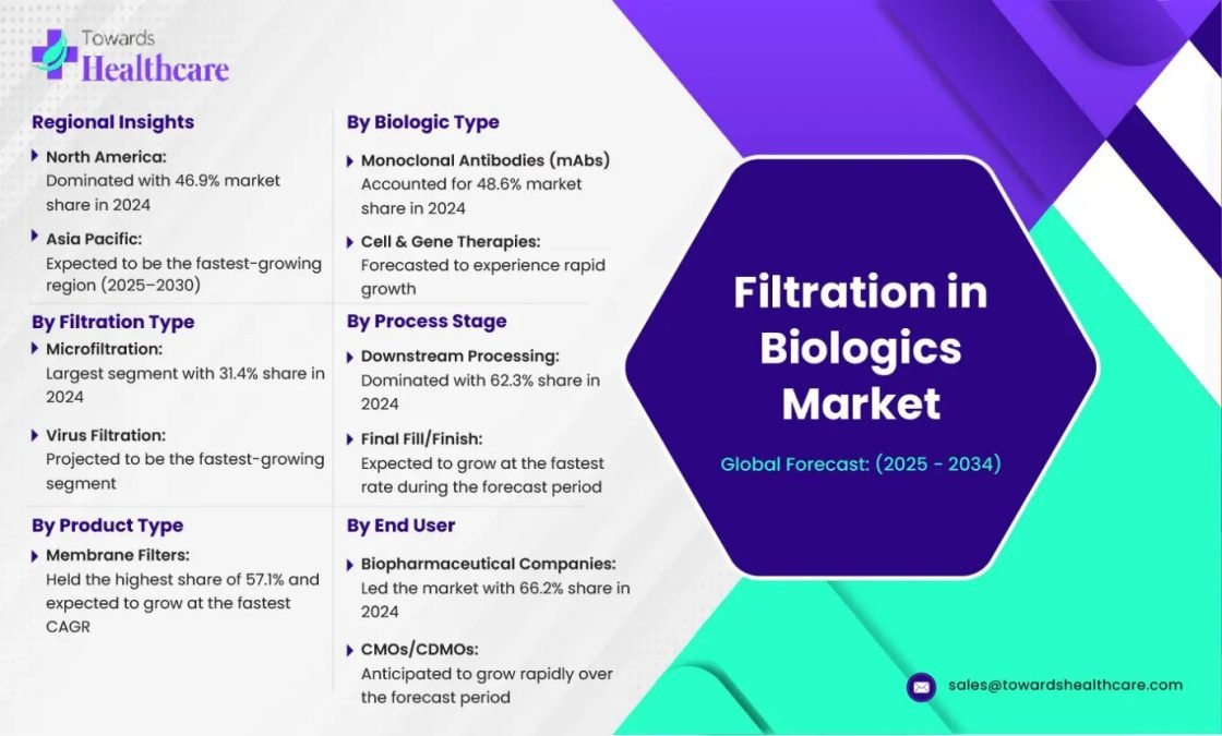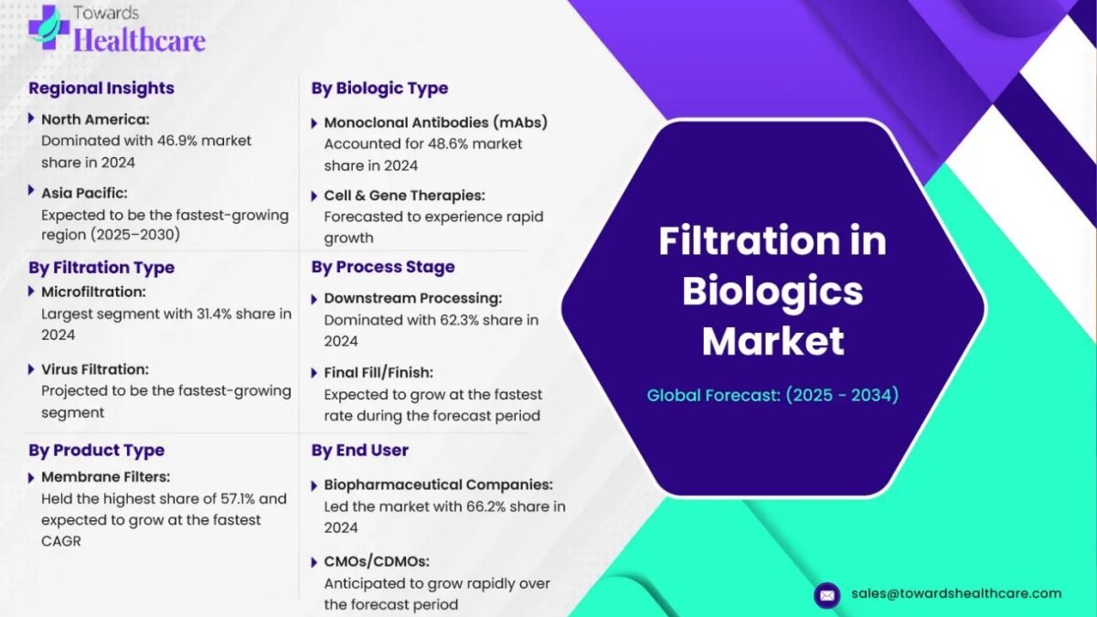 Ottawa, Oct. 24, 2025 (GLOBE NEWSWIRE) — The filtration in biologics market is set for significant growth from 2024 to 2034, fueled by rising global demand for monoclonal antibodies, vaccines, and cell and gene therapies. Innovations in bioprocessing technologies, coupled with expanding biologics manufacturing, are driving the adoption of advanced filtration systems.