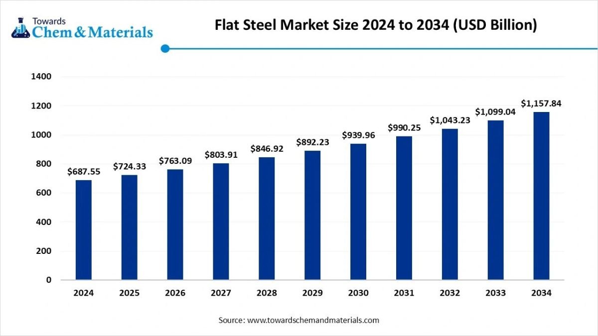 According to Towards Chemical and Materials, the global flat steel market size is calculated at USD 724.33 billion in 2025 and is expected to hit around USD 1,157.84 billion by 2034 from USD 763.09 billion in 2026, growing at a CAGR of 5.35% from 2025 to 2034.