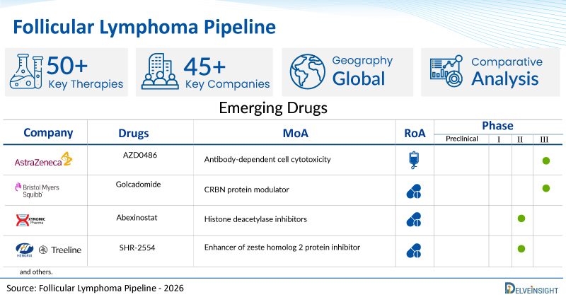 - DelveInsight’s follicular lymphoma pipeline report depicts a robust space with 45+ active players working to develop 50+ pipeline follicular lymphoma drugs.
