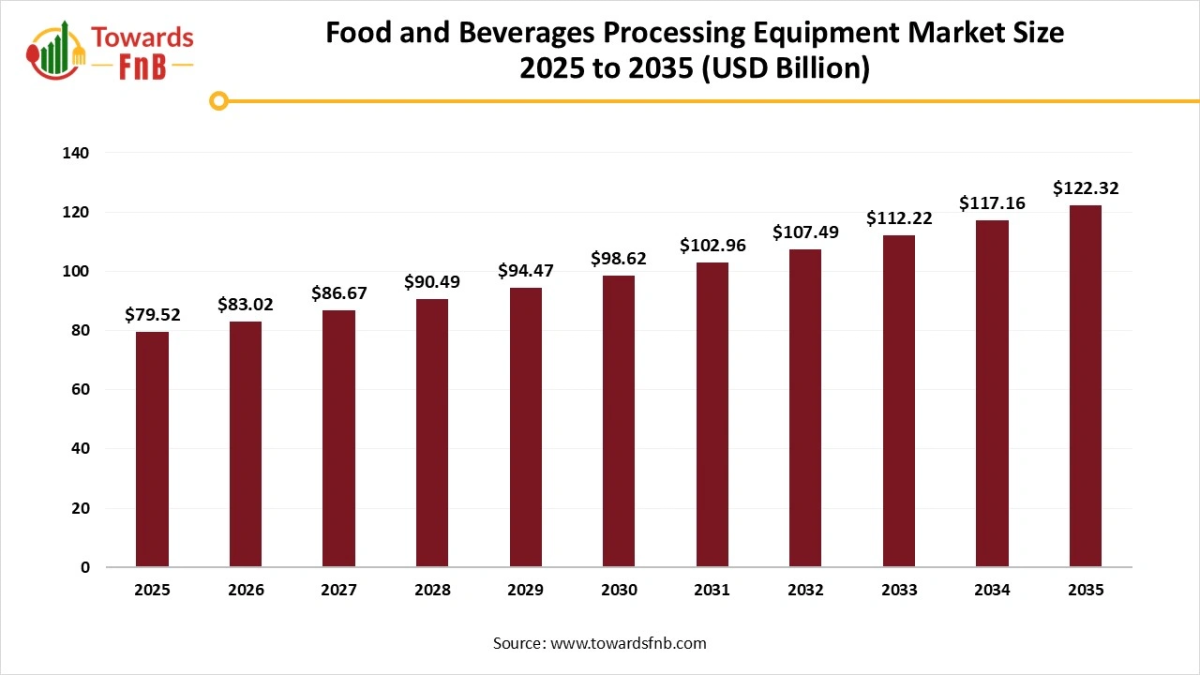 Ottawa, Jan. 13, 2026 (GLOBE NEWSWIRE) — The global food and beverage processing equipment market size stood at USD 79.52 billion in 2025 and is predicted to grow from USD 83.02 billion in 2026 to reach around USD 122.32 billion by 2035. A report published by Towards FnB, a sister firm of Precedence Research, highlighting steady investment in automation, food safety, and high-efficiency processing technologies across the industry.