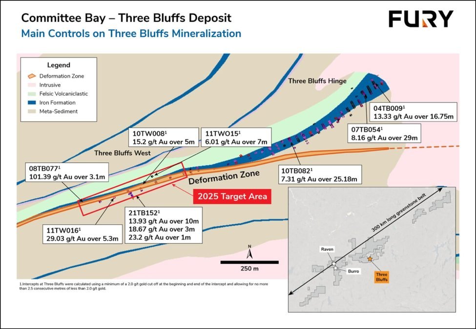 TORONTO, July 14, 2025 (GLOBE NEWSWIRE) — Fury Gold Mines Limited (TSX and NYSE American: FURY) (“Fury” or the “Company”) is pleased to announce that the 2025 exploration drilling program has commenced at the Committee Bay project, located in the eastern Kitikmeot region of Nunavut, Canada. The 2025 drilling program will comprise 7 – 10 diamond drill holes totaling approximately 5,000 metres (m) focused on: expansion of the Three Bluffs Shear Zone target, testing regional shear zones along the southern contact of the 8 kilometre (km) long Raven shear zone, and testing regional shear zones at Burro West.