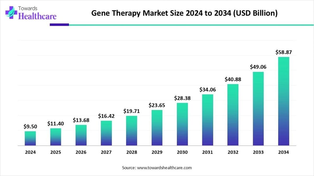 Ottawa, Oct. 08, 2025 (GLOBE NEWSWIRE) — The global gene therapy market size was valued at USD 9.50 billion in 2024 and is predicted to hit around USD 58.87 billion by 2034, rising at a 20% CAGR, a study published by Towards Healthcare a sister firm of Precedence Research.
