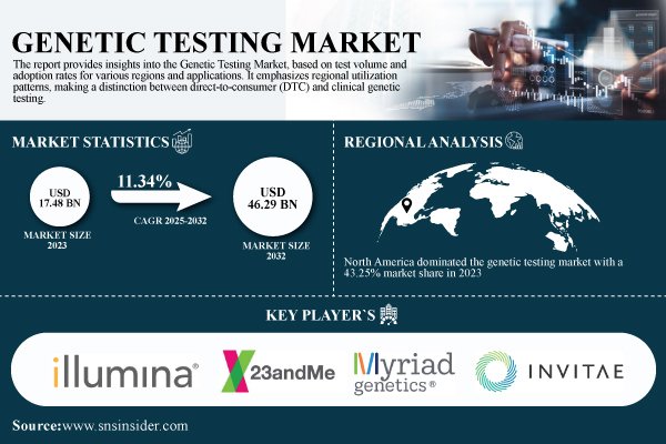 According to S&S Insider, The Global Genetic Testing Market Size was valued at USD 17.48 billion in 2023, and is expected to reach USD 46.29 billion by 2032, expanding at a CAGR of 11.34% during 2024-2032. This market growth is driven by the rising incidence of genetic disorders and cancer, technological advancements such as NGS, increase in the use of genetic testing for personalized medicine and awareness regarding reducing drug development costs.