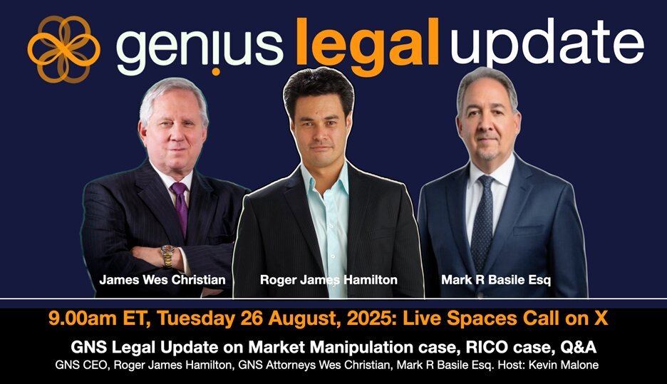 SINGAPORE, Aug. 18, 2025 (GLOBE NEWSWIRE) — Genius Group Limited (NYSE American: GNS) (“Genius Group” or the “Company”), a leading AI-powered, Bitcoin-first education group, has scheduled a Live Spaces call on X.com at 9.00am Eastern Time, August 26, 2025 to provide a legal update and host a Q&A on the Company’s market manipulation lawsuit and RICO lawsuit.