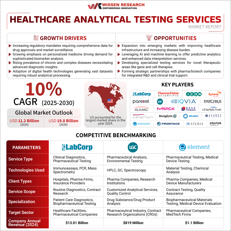 Sheridan, Sept. 30, 2025 (GLOBE NEWSWIRE) — According to the latest market report published by Wissen Research, the global healthcare analytical testing services market was valued at USD 11.2 billion in 2024. Furthermore, the market is expected to grow at a CAGR of 10% during the forecast period from 2025 to 2030.