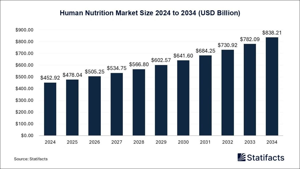 Ottawa, Sept. 18, 2025 (GLOBE NEWSWIRE) — As per Statifacts, the global human nutrition market reached a size of over USD 452.92 billion in 2024 and is anticipated to reach to around USD 838.21 billion by 2034, with a compound annual growth rate (CAGR) of 6.34% throughout the forecast period from 2025 to 2034. The rising demand for nutritional supplements, increasing health consciousness, growing disposable income, and rising demand for fortified food products are driving the market’s growth.