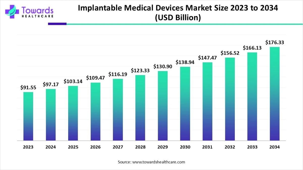 Ottawa, Oct. 31, 2025 (GLOBE NEWSWIRE) — The global implantable medical devices market size was valued at USD 97.17 billion in 2024 and is predicted to hit around USD 176.33 billion by 2034, rising at a 6.14% CAGR, a study published by Towards Healthcare a sister firm of Precedence Research.