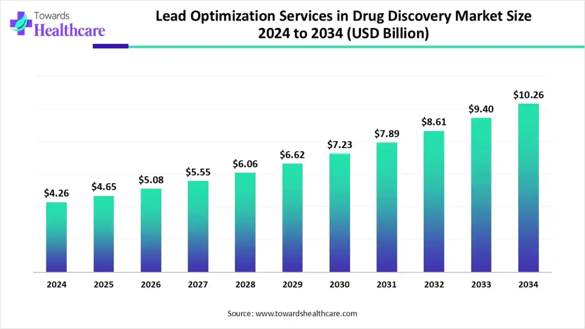 The global lead optimization services in drug discovery market size was valued at USD 4.26 billion in 2024 and is predicted to hit around USD 10.26 billion by 2034, rising at a 9.23% CAGR, a study published by Towards Healthcare a sister firm of Precedence Research.