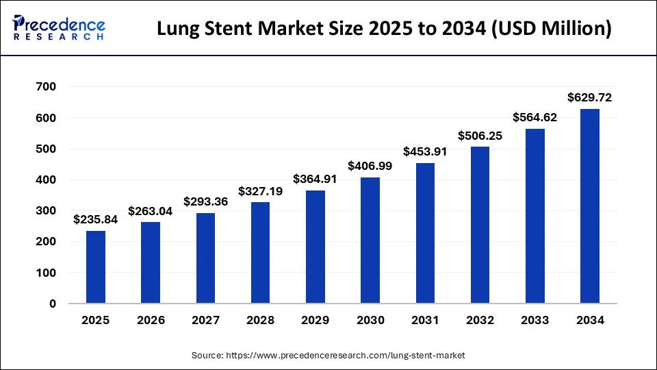 According to Precedence Research, the global lung stent market size will grow from USD 235.84 million in 2025 to nearly USD 629.72 million by 2034, with an expected CAGR of 11.53% from 2025 to 2034.
