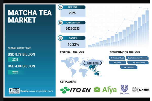 Austin, Jan. 30, 2026 (GLOBE NEWSWIRE) — According to SNS Insider, The Matcha Tea Market Size is estimated at USD 4.04 Billion in 2025 and is projected to reach USD 8.79 Billion by 2033, growing at a CAGR of 10.22% during 2026–2033. Over the course of the forecast period, rising consumer demand for wellness drinks, lifestyle goods, and natural antioxidants is expected to drive market expansion.
