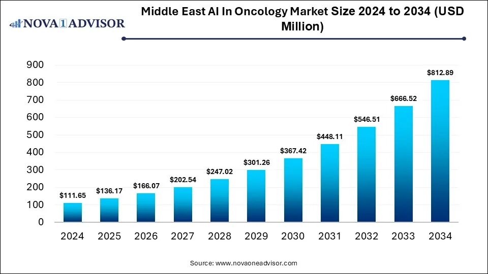 According to Nova One Advisor, the Middle East AI in oncology market size was estimated at USD 136.17 million in 2025 and is expected to hit around USD 812.89 million by 2034, growing at a compound annual growth rate (CAGR) of 21.96% over the forecast period from 2025 to 2034. A study published by Nova One Advisor a sister firm of Precedence Research.