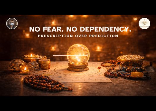 His tools — a proprietary system drawing from multiple astrological fields, combined with numerology, vastu, crystals, rudraksha, mantra, yantra, and daan — are used to prescribe alignment over prediction. The inner vibration, the Spandan and Urja through which the present is being experienced, is always the point of address.
