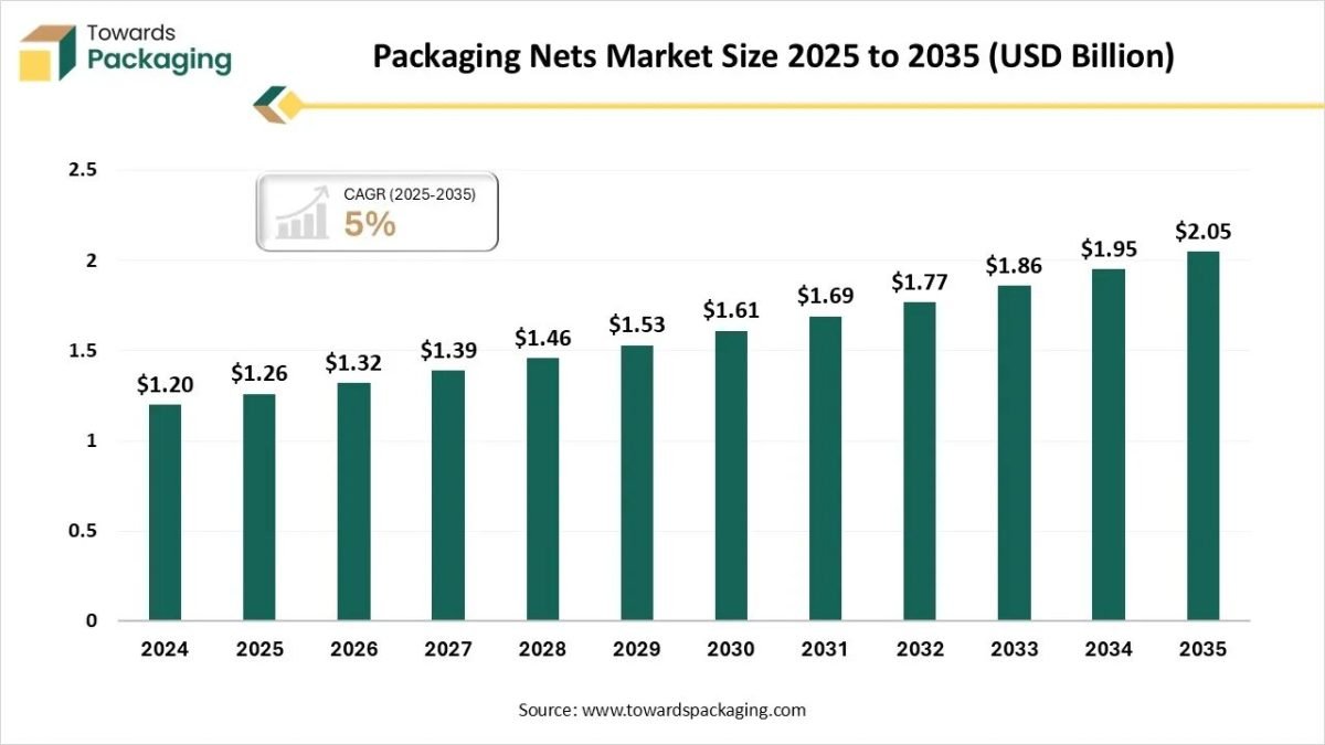 As highlighted by Towards Packaging research, the global packaging nets market, valued at USD 1.26 billion in 2025, is expected to reach USD 2.05 billion by 2034, registering a CAGR of 5% throughout the forecast period.