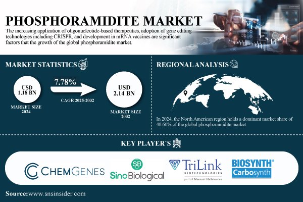 According to SNS Insider, the global Phosphoramidite Market was valued at USD 1.18 billion in 2024 and is projected to reach USD 2.14 billion by 2032, growing at a CAGR of 7.78% during the forecast period of 2025–2032.