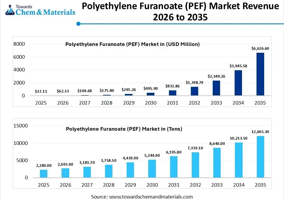 According to Towards Chemical and Materials, the global polyethylene furanoate (PEF) market volume was valued at 2,280.0 tons in 2025 and is expected to be worth around 12,065.3 tons by 2035, exhibiting at a compound annual growth rate (CAGR) of 18.13% over the forecast period from 2026 to 2035.