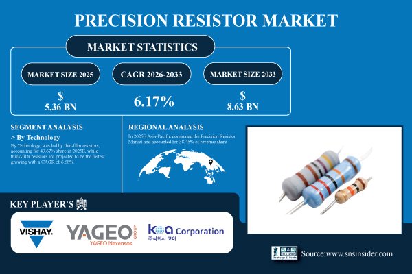 According to the SNS Insider,“The Precision Resistor Market size was valued at USD 5.36 Billion in 2025E and is projected to reach USD 8.63 Billion by 2033, growing at a CAGR of 6.17% during 2026-2033.”