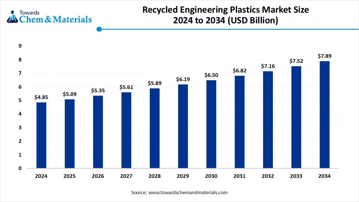 Towards Chemical and Materials Consulting, the global recycled engineering plastics market size is accounted at USD 5.09 billion in 2025 and predicted to increase from USD 5.35 billion in 2026 to approximately USD 7.89 billion by 2034, expanding at a CAGR of 4.99% from 2025 to 2034.