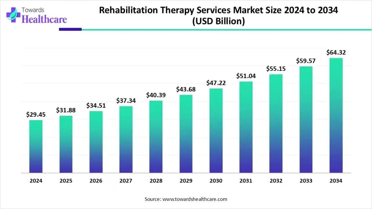 Ottawa, Nov. 12, 2025 (GLOBE NEWSWIRE) — The global rehabilitation therapy services market size was valued at USD 29.45 billion in 2024 and is predicted to hit around USD 64.32 billion by 2034, rising at a 8.24% CAGR, a study published by Towards Healthcare a sister firm of Precedence Research. The growth of the market is driven by increased chronic diseases and technological advancements like tele-rehabilitation and robotics.