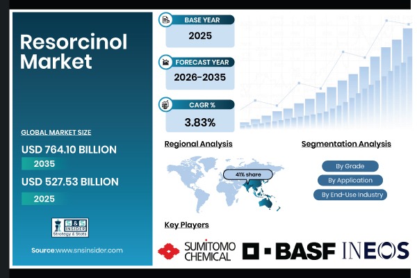 Austin, April 20, 2026 (GLOBE NEWSWIRE) — The Resorcinol Market was valued at USD 527.53 billion in 2025 and is expected to reach USD 764.10 billion by 2035, growing at a CAGR of 3.83% over the forecast period of 2026-2035.
