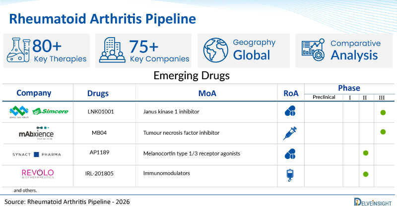 - DelveInsight’s rheumatoid arthritis pipeline report depicts a robust space with 75+ active players working to develop 80+ pipeline rheumatoid arthritis drugs.