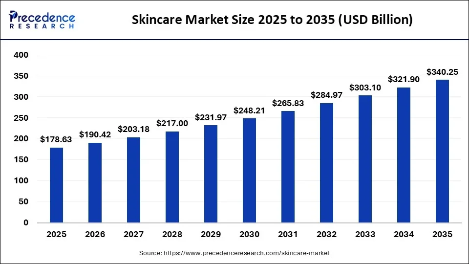 According to Precedence Research, the skincare market size surpassed USD 178.63 billion in 2025 and is estimated to hit around USD 340.25 billion by 2035, growing at a CAGR of 6.66% from 2026 to 2035. The growing wellness trend and the focus on clean beauty drive the skincare market growth.