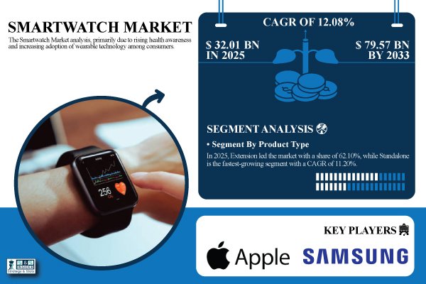 According to the SNS Insider,“The Smartwatch Market Size was valued at USD 32.01 Billion in 2025E and is expected to reach USD 79.57 Billion by 2033, growing at a CAGR of 12.08% during 2026-2033.”