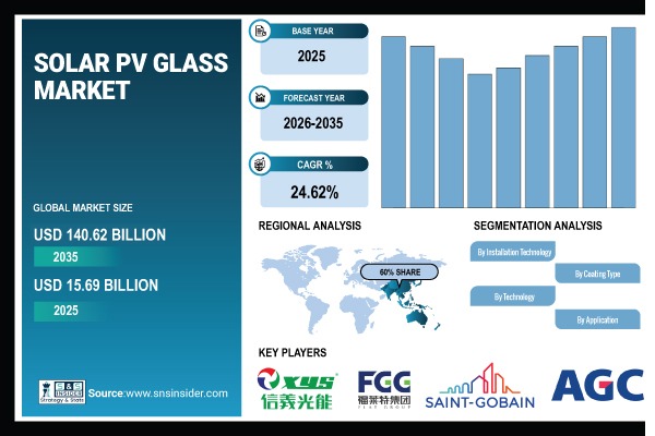 According to the SNS Insider,The Solar PV Glass Market Size was valued at USD 15.69 billion in 2025 and is expected to reach USD 140.62 billion by 2035, growing at a CAGR of 24.62% over 2026-2035.”