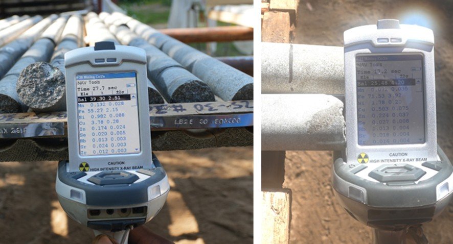 Figure 1: Hole LB-25-30 sulphide blobs at 1,297 m and 1,324 m in the Magmatic Intrusive Diorite. The figure is showing XRF reading taken by Dr Audet acting as the QP1.