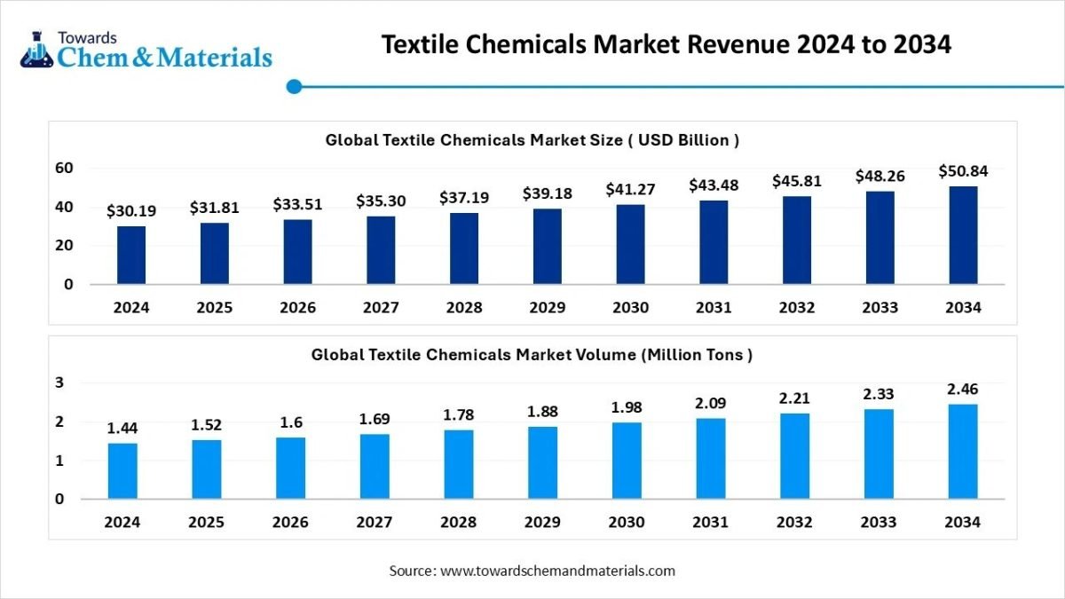 According to Towards Chemical and Materials, the global textile chemicals market stands at 1.52 million tons in 2025 and is forecast to reach 2.46 million tons by 2034, growing at a CAGR of 5.49% from 2025 to 2034.