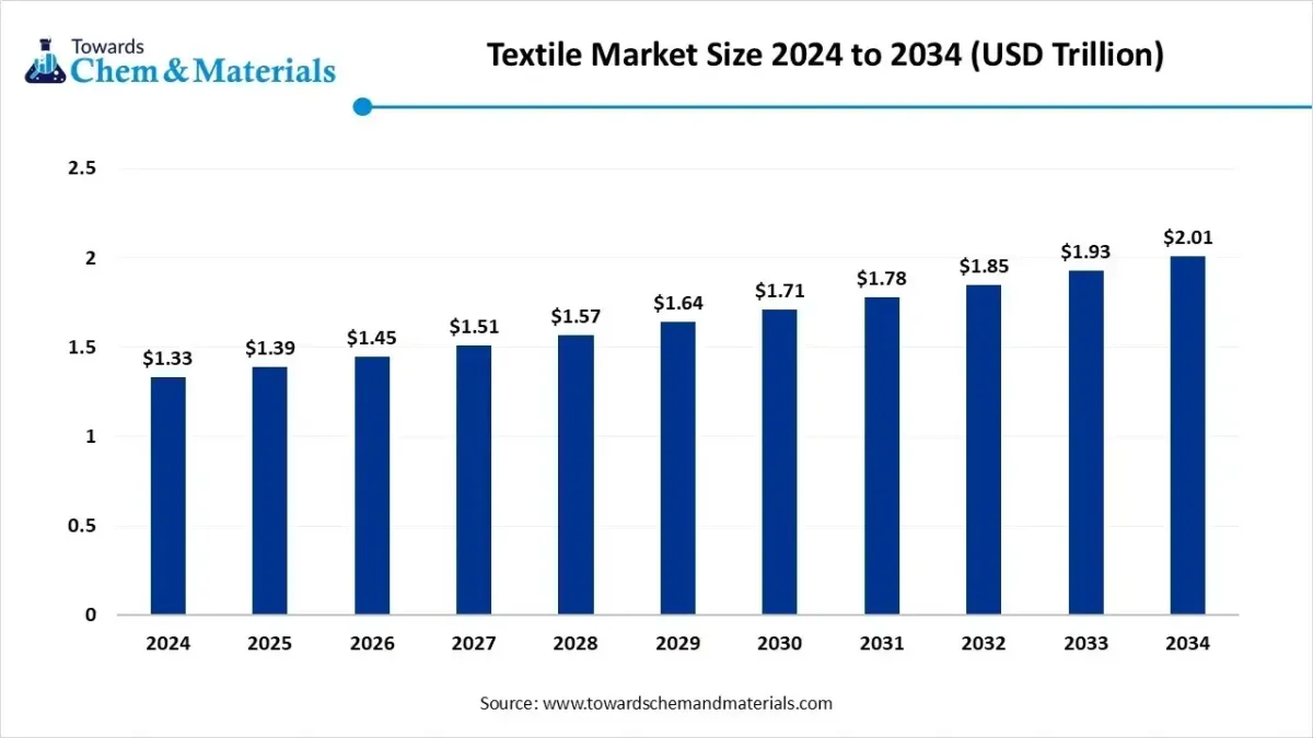 According to Towards Chemical and Materials Consulting, the global textile market size is calculated at USD 1.39 trillion in 2025 and is expected to surpass around USD 2.01 trillion by 2034, growing at a CAGR of 4.24% from 2025 to 2034.