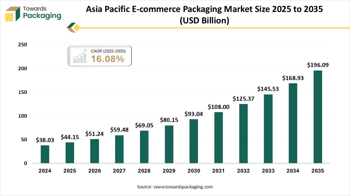 According to researchers from Towards Packaging, the Asia Pacific e-commerce packaging market, estimated at USD 44.15 billion in 2025, is forecast to expand to USD 196.09 billion by 2034, growing at a CAGR of 16.08% over the forecast period.