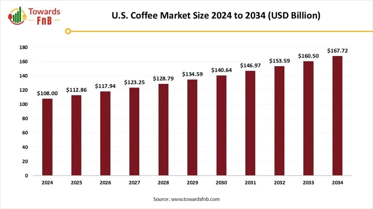 Ottawa, Sept. 30, 2025 (GLOBE NEWSWIRE) — The U.S. coffee market size stood at USD 108 billion in 2024 and is anticipated to increase from USD 112.86 billion in 2025 to reach nearly USD 167.72 billion by 2034, at a CAGR of 4.5% from 2025 to 2034, according to study published by Towards FnB, a sister firm of Precedence Research.